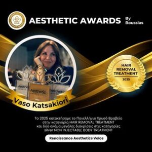 Το κέντρο αισθητικής Renaissance Aesthetics διακρίθηκε με το πανελλήνιο Χρυσό Βραβείο στην κατηγορία: Independent Aesthetic Center – Rest of Greece/Volos για το 2022. Επιπλέον, απέσπασε ξεχωριστή διάκριση για την υπηρεσία ΒΑΘΥΣ ΔΕΡΜΑΤΟΛΟΓΙΚΟΣ ΚΑΘΑΡΙΣΜΟΣ ΠΡΟΣΩΠΟΥ: Πανελλήνιο Χάλκινο βραβείο στην κατηγορία: Βαθύς καθαρισμός προσώπου – Peeling.